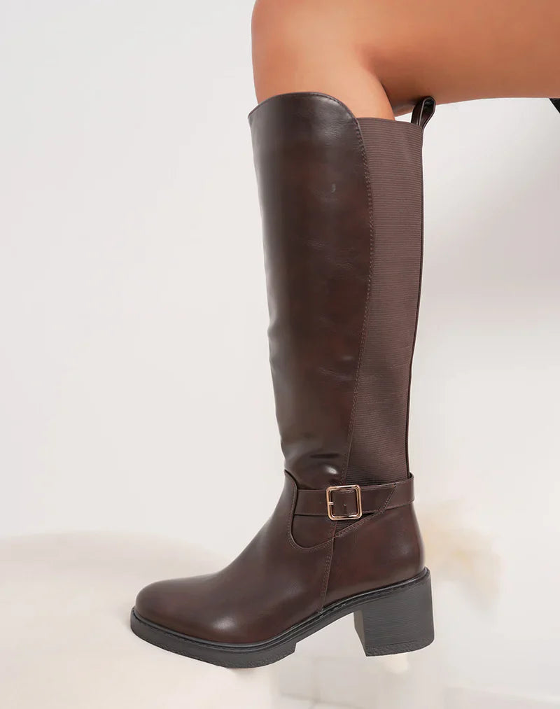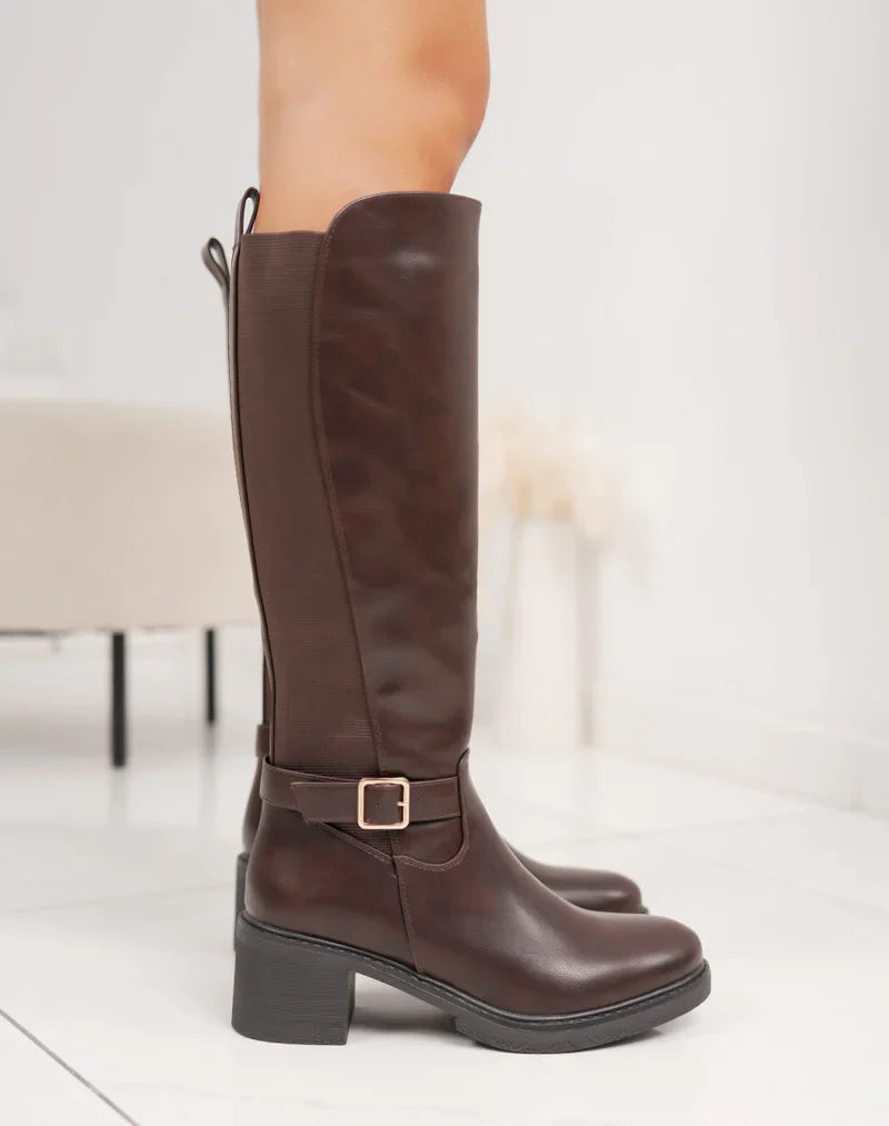 De Monja Hoge Laarzen zijn perfect voor de koudere dagen. De zachte voering houdt je voeten lekker warm en de stevige hak van 6 cm zorgt voor een mooie houding zonder in te leveren op comfort. Dankzij het elastische inzetstuk sluiten de laarzen goed aan rond de kuit en zitten ze de hele dag prettig. De goudkleurige gesp aan de zijkant geeft de laars een mooi detail. Makkelijk te combineren met een jurk, rok of broek voor een vrouwelijke en dagelijkse look.